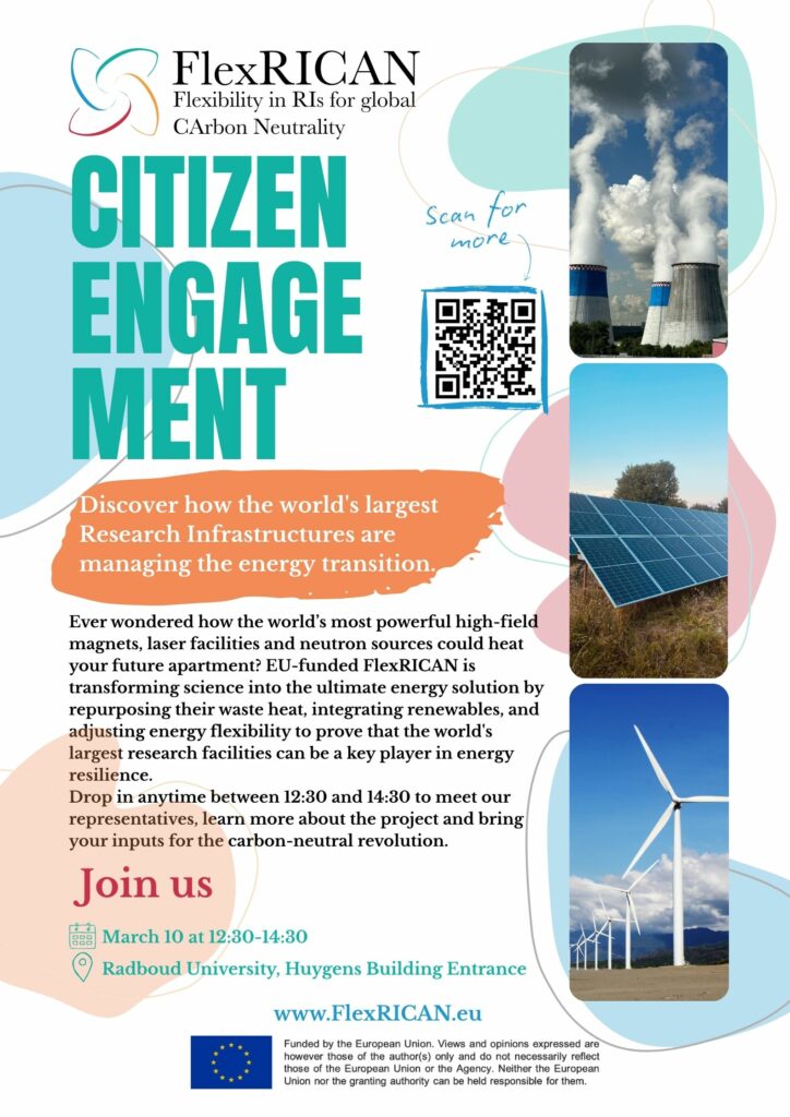 Drop by at 12:30-14:30 on March 10 to see the latest sustainable energy practices from the world’s largest facilities and provide your input on how big science can go carbon neutral. Registration is not needed. Join the FlexRICAN team and HFML-FELIX experts at the Huygens Building entrance to see how Research Infrastructures (RIs) utilise waste heat, integrate renewables and adopt grid flexibility.
